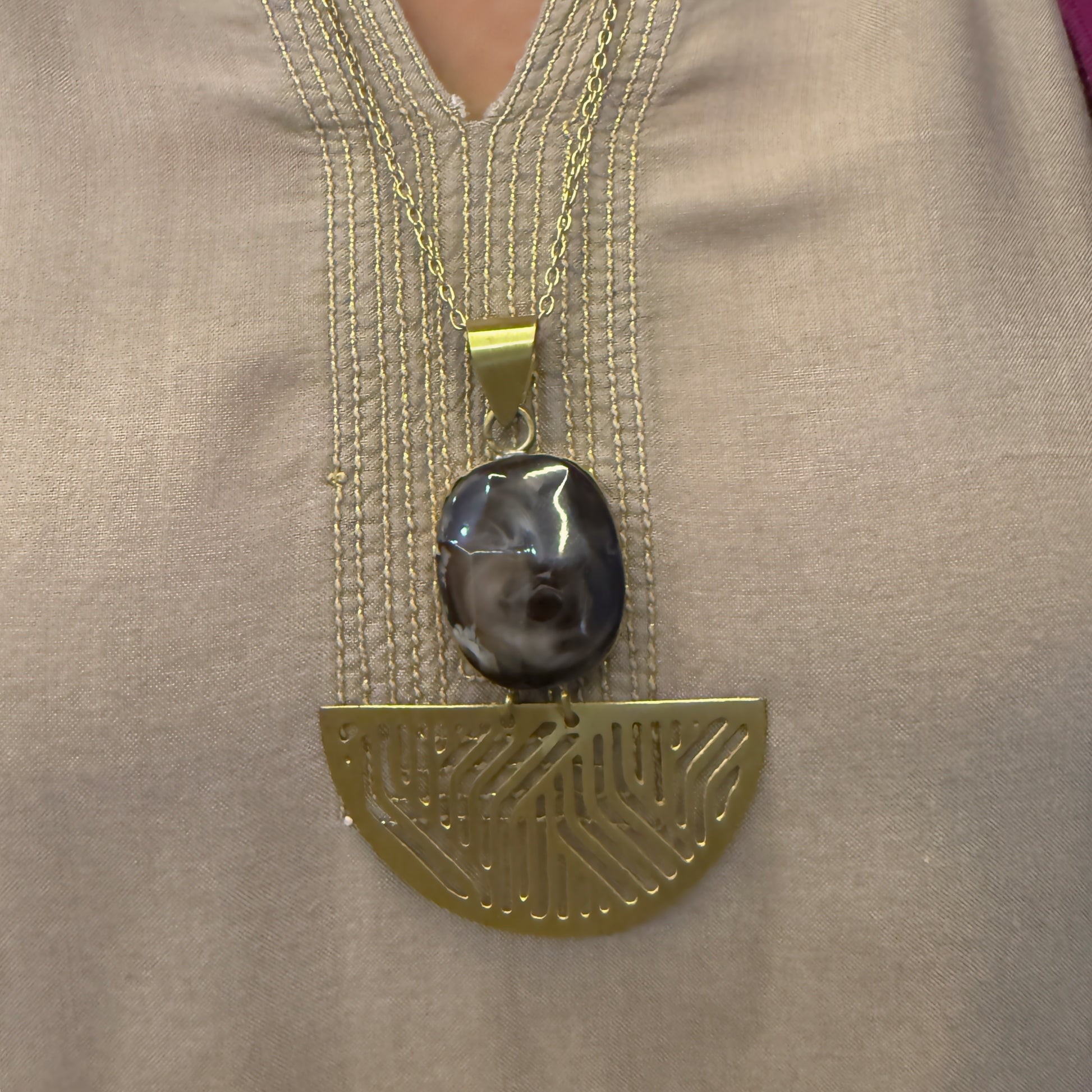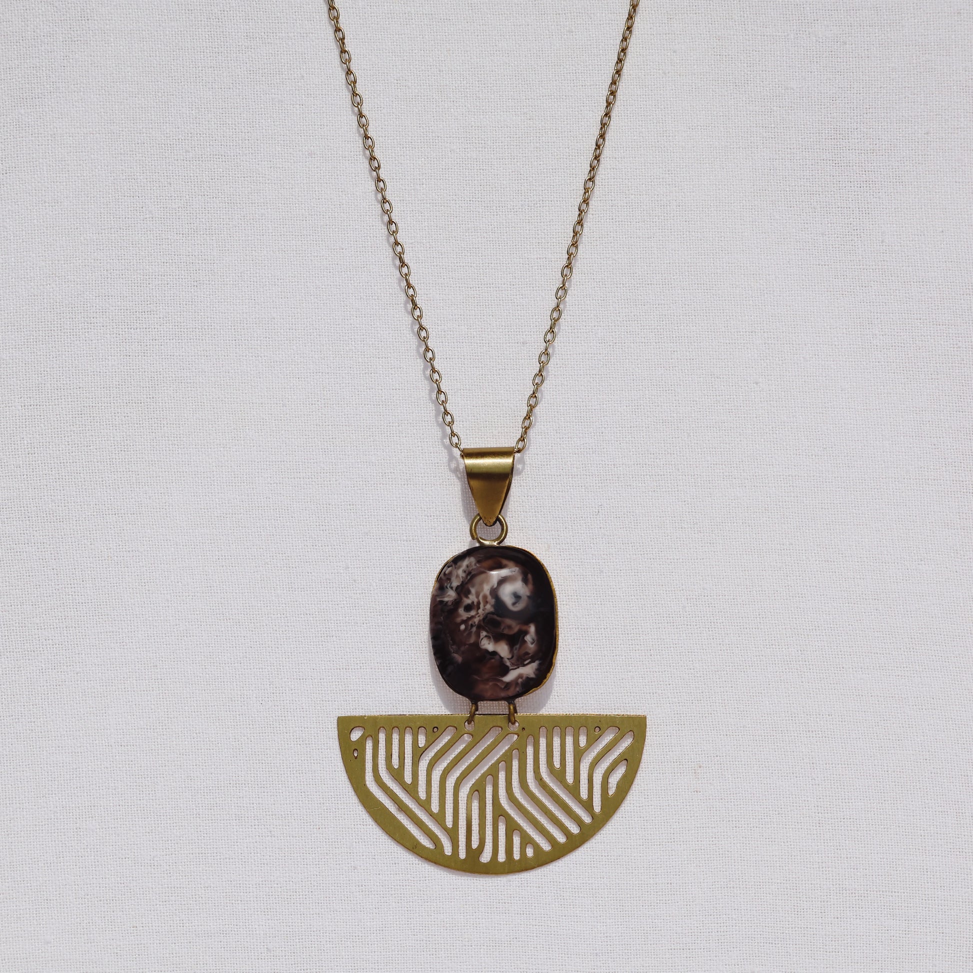 Handcrafted in gold-plated, anti-tarnish brass, this necklace will instantly ground you like the trees in the forest. Wear it to enhance a more casual look, such as t-shirts or sweaters, or pair it with a more dressier outfit and allow the stone to shine.