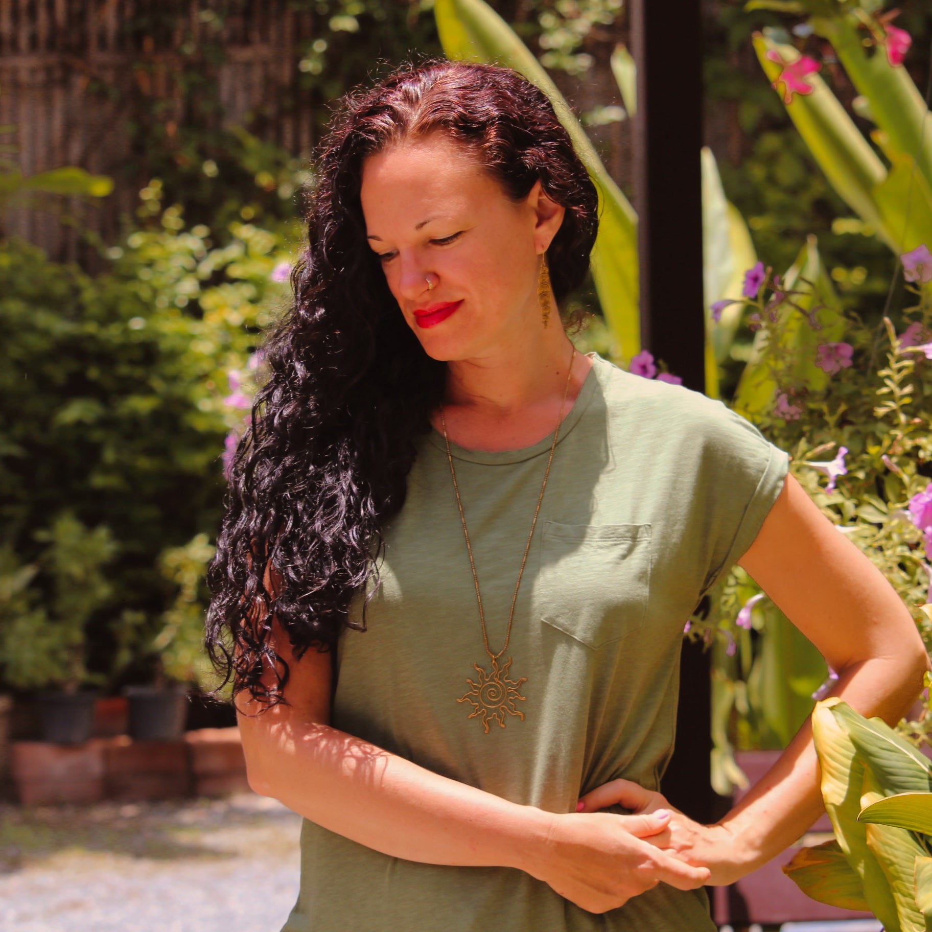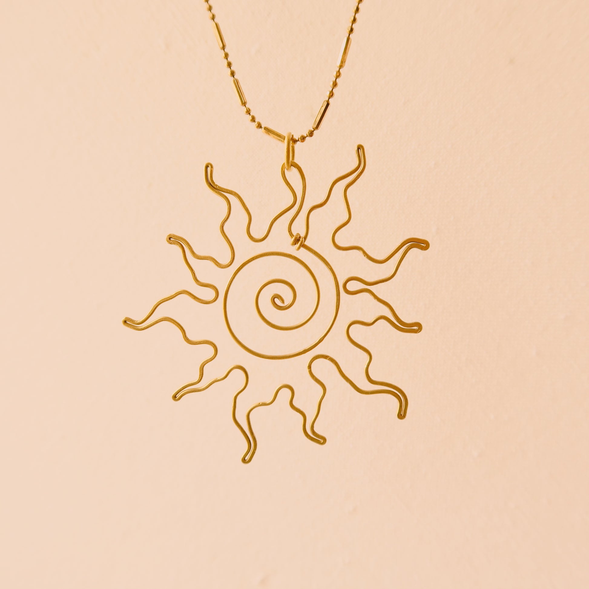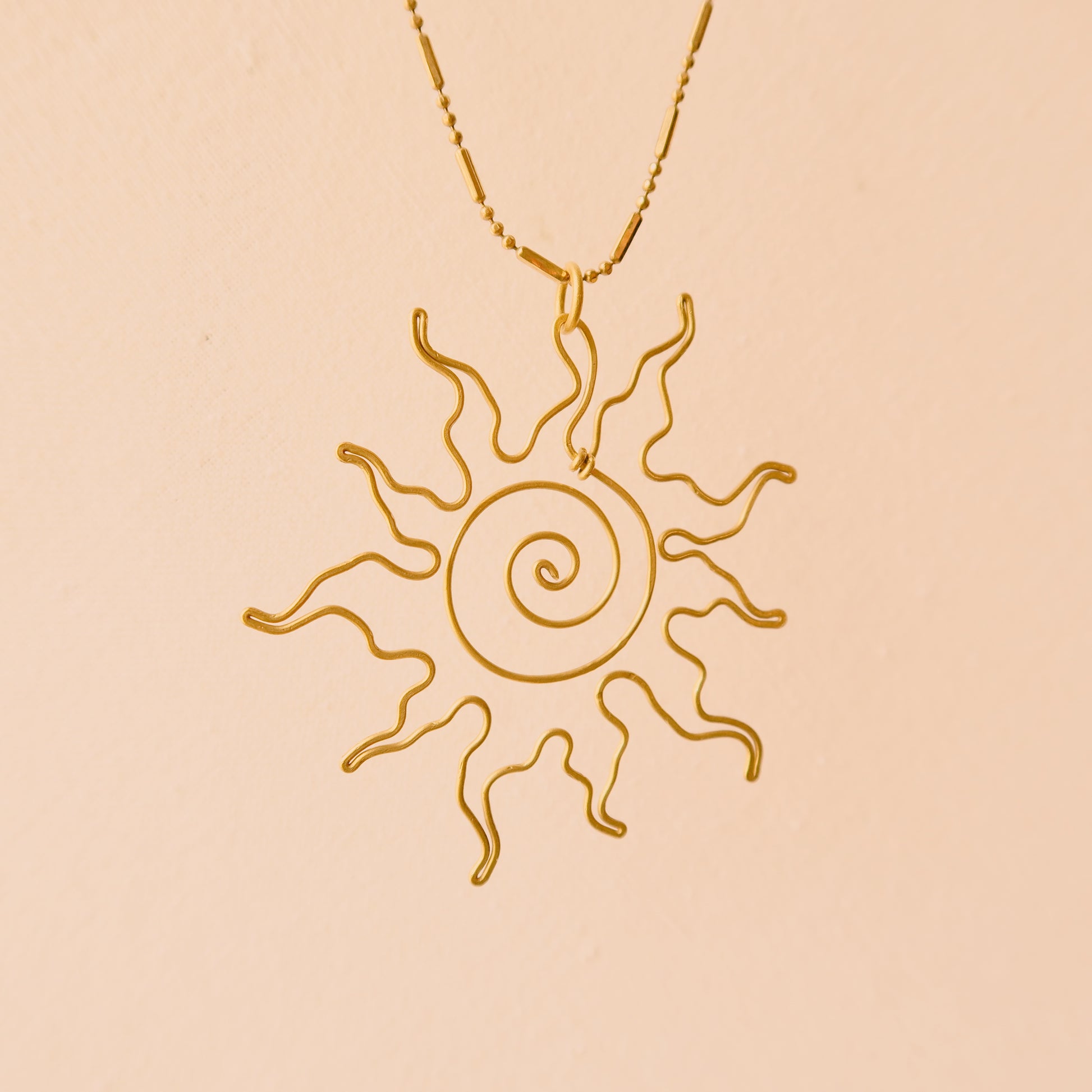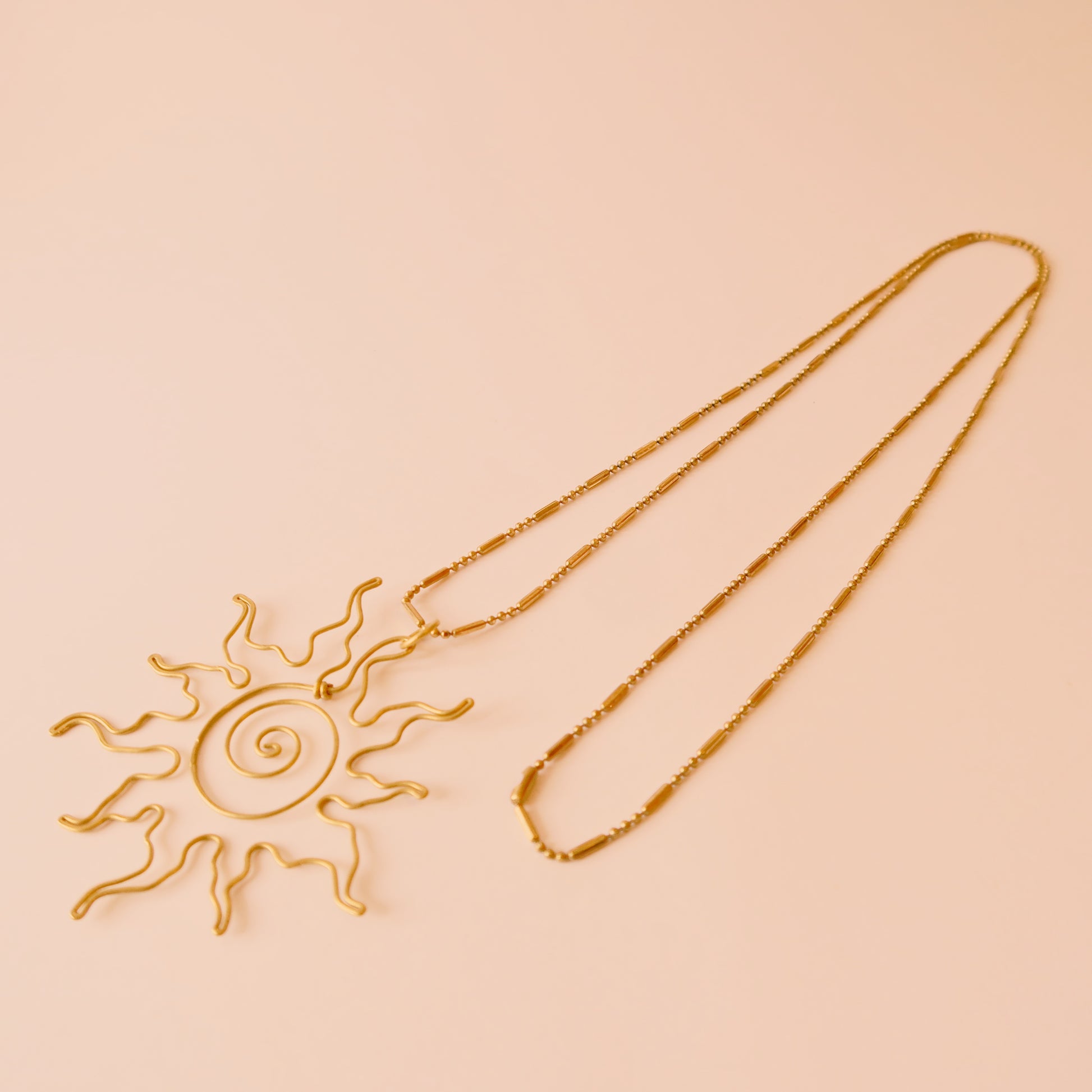 Handcrafted by artisans, featuring thin brass woven into a creative sunray design, hanging from a brass chain. Pair it with our Sunray Earrings to complete your look.