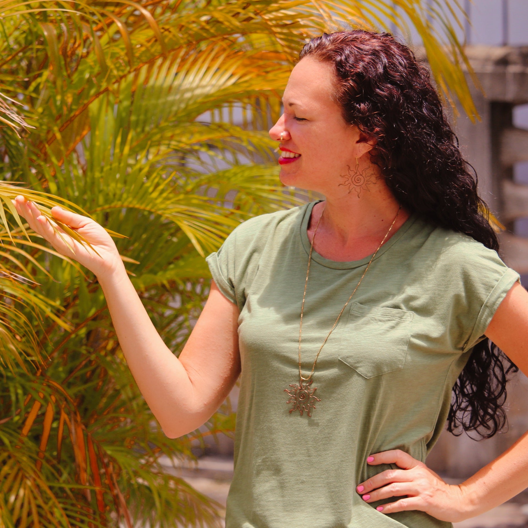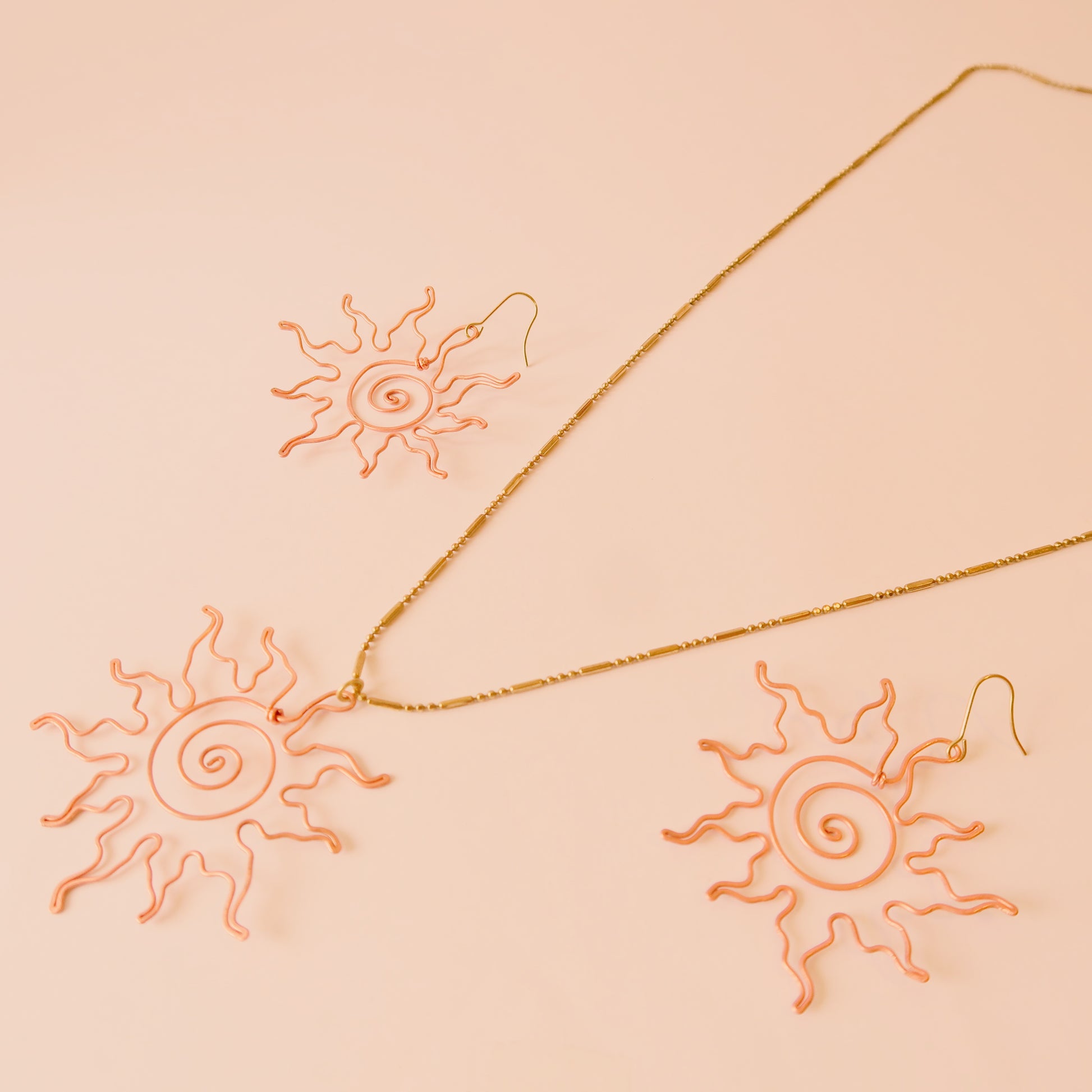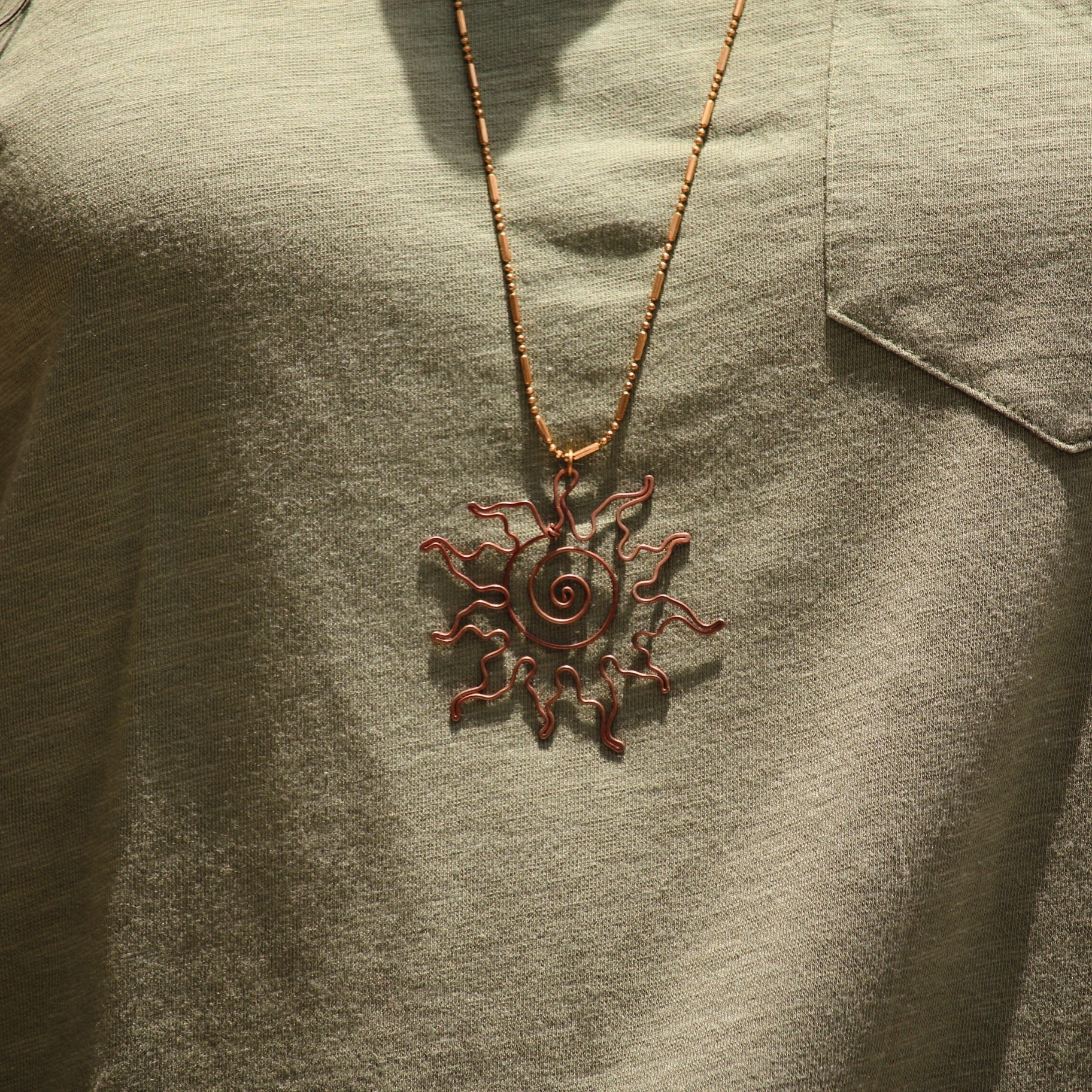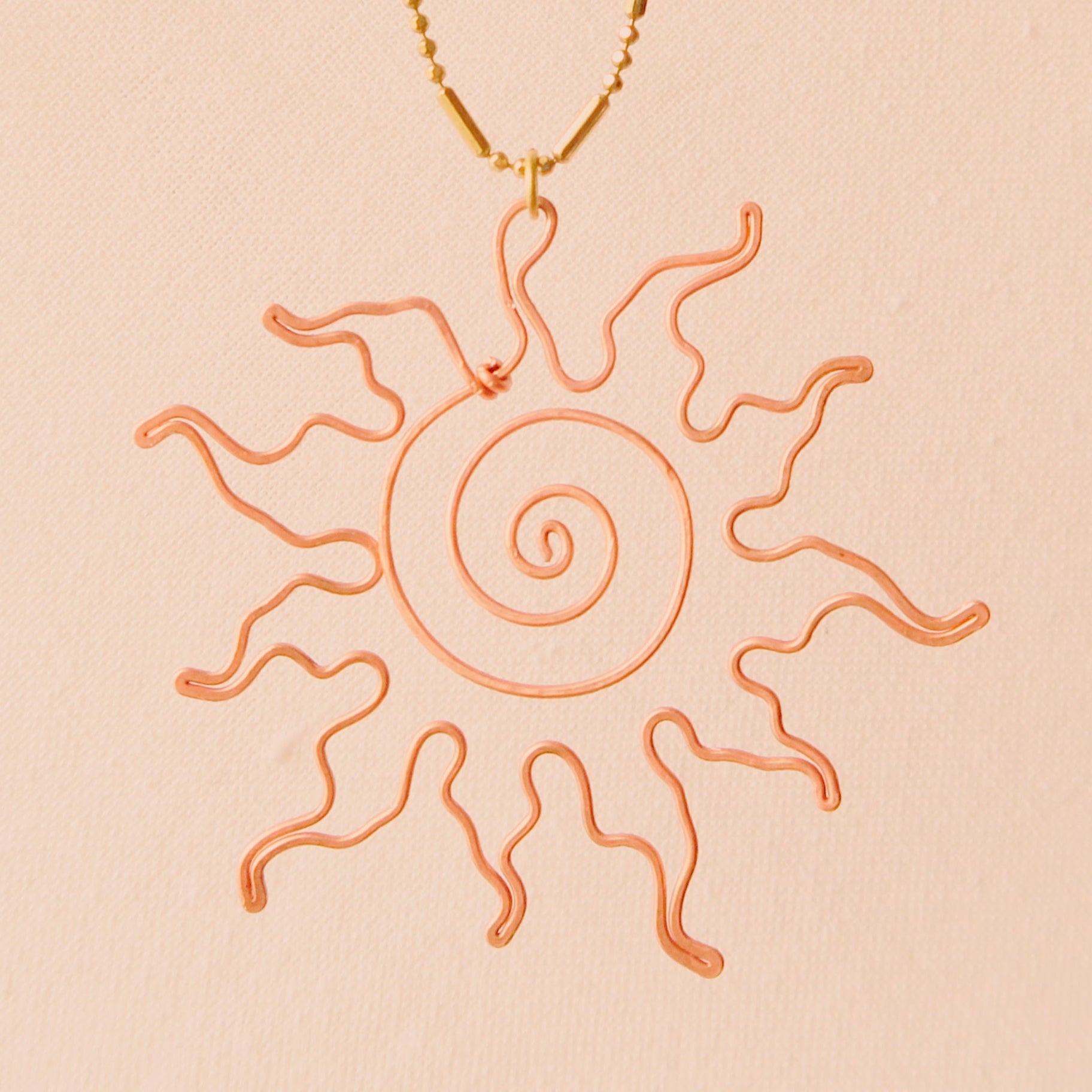 Handcrafted by artisans, featuring thin copper wire woven into a creative sunray design, which is hanging from a brass chain. Pair it with our Sun Copper Earrings to complete your look.