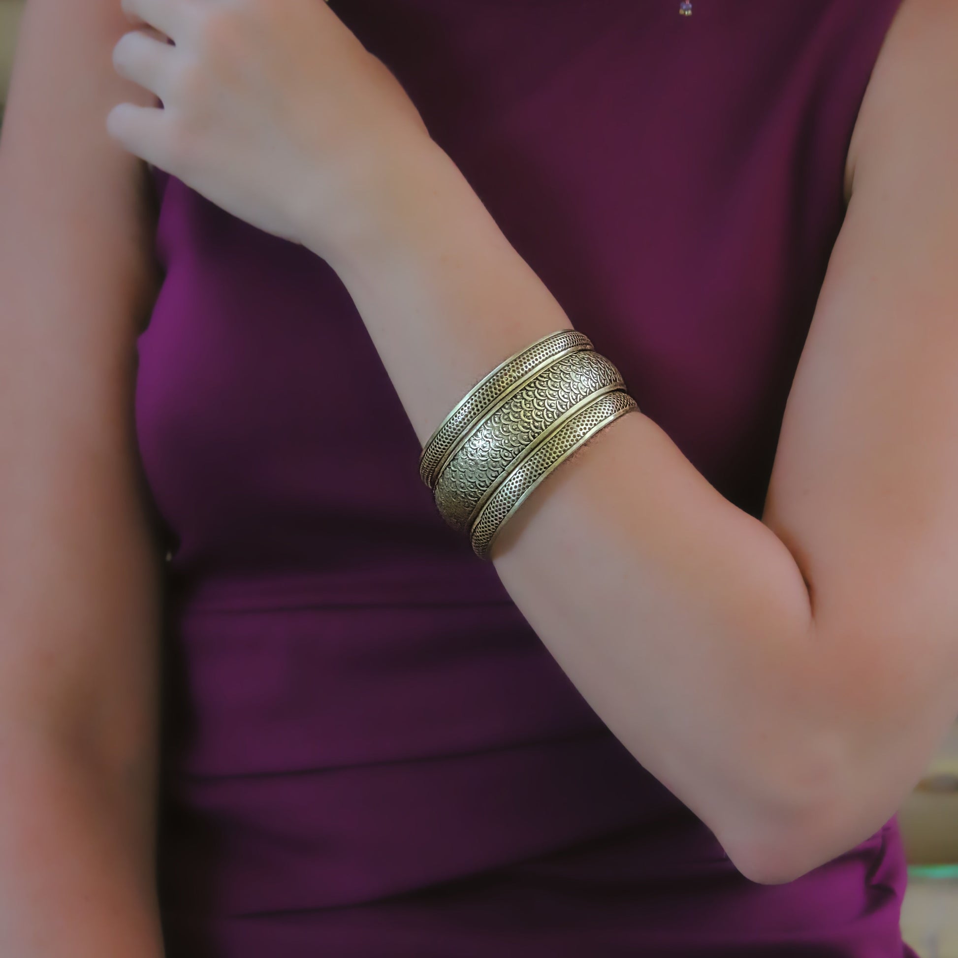 Hand-crafted in anti-tarnish brass and featuring a trendy etched design, this bangle is perfectly paired or stacked. You will also make a bold choice by wearing it solo. Slip it on with something a little more casual to elevate the look or pair it with your dress, saree or other dressy outfit. People will be wondering where you got such a detailed piece.