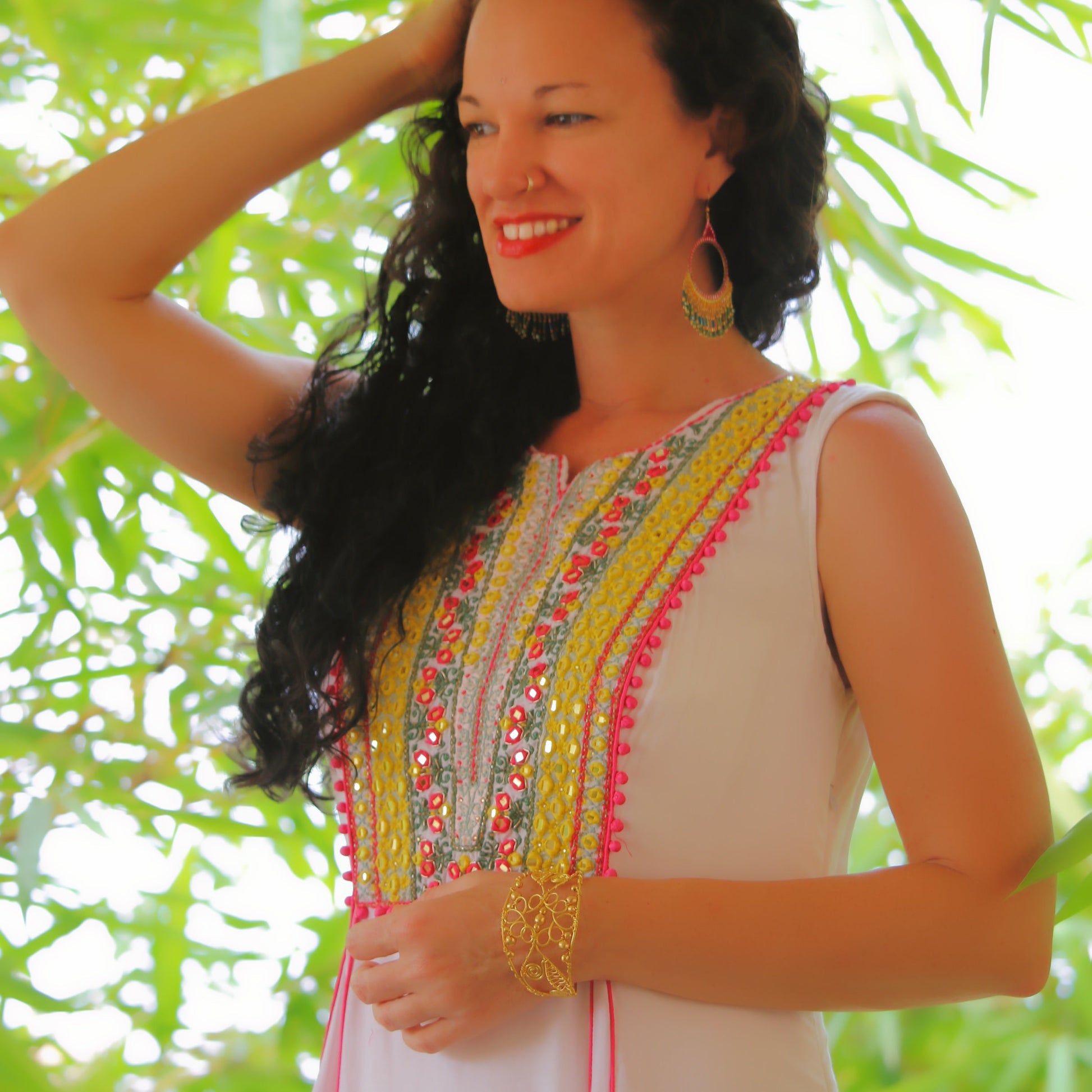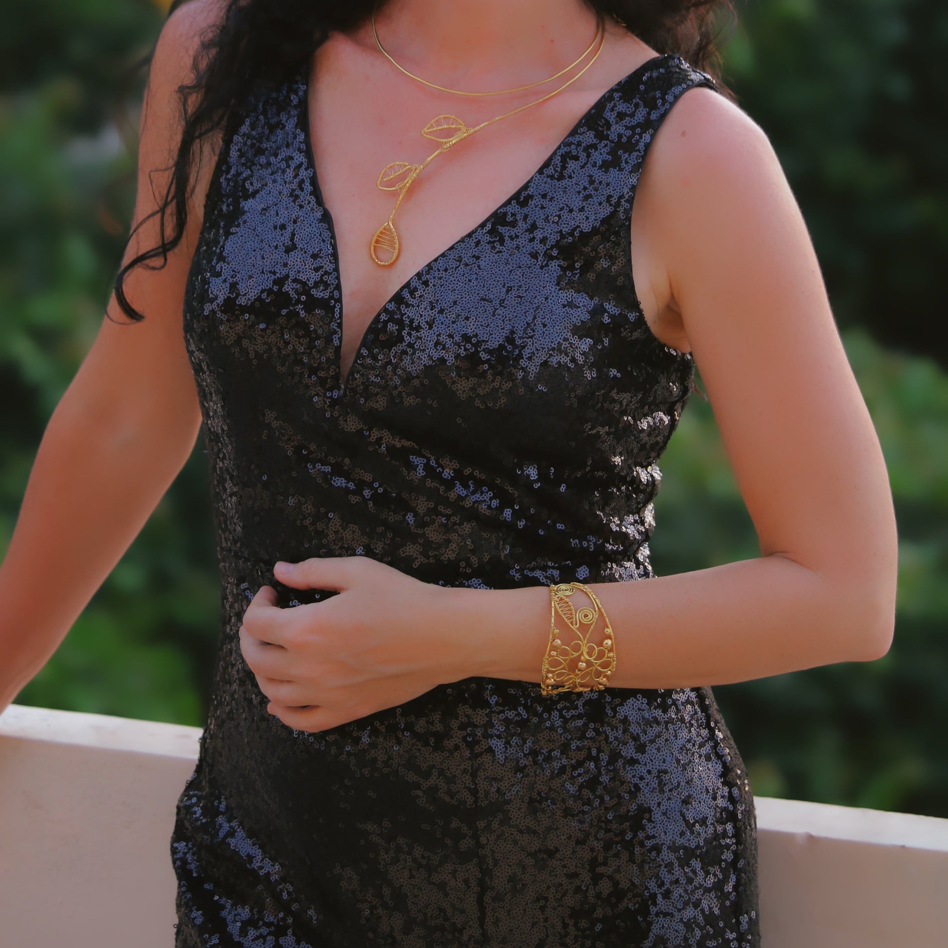 Our Glittery Goa Bracelet is a knockout piece which will make you the center of attention at your next event. Its hand-beaten brass design and intricate wire detailing with beadwork, exhibit the true creativity of the Indian artisan who crafted it just for you. Enjoy wearing this cuff when you want that extra special look.