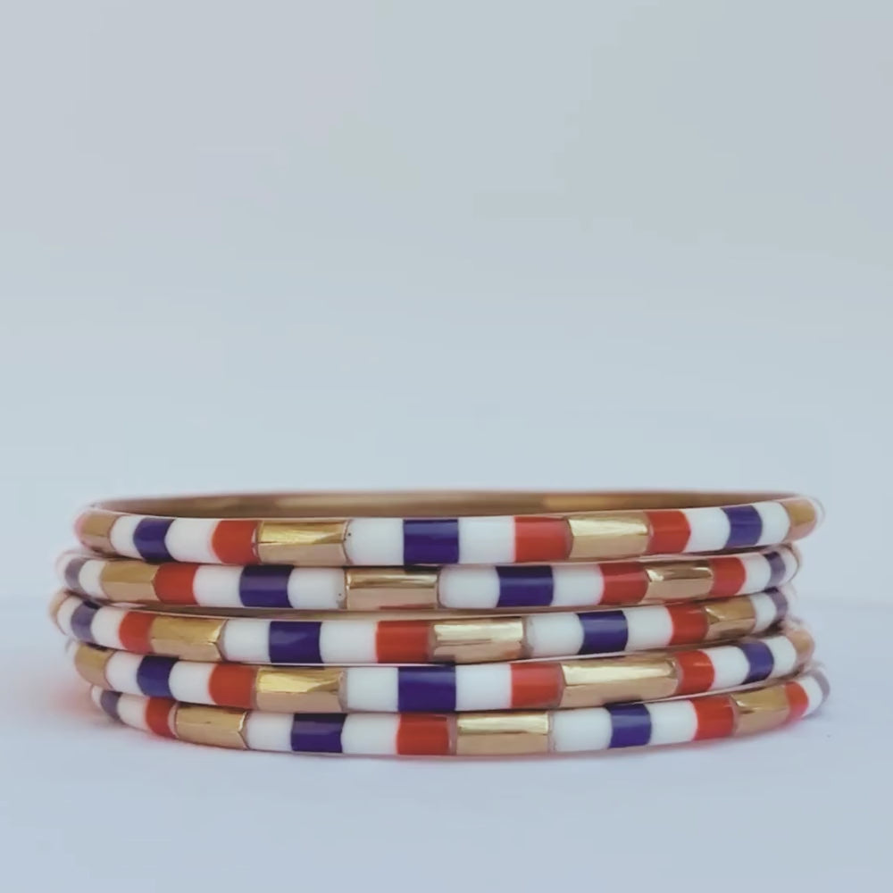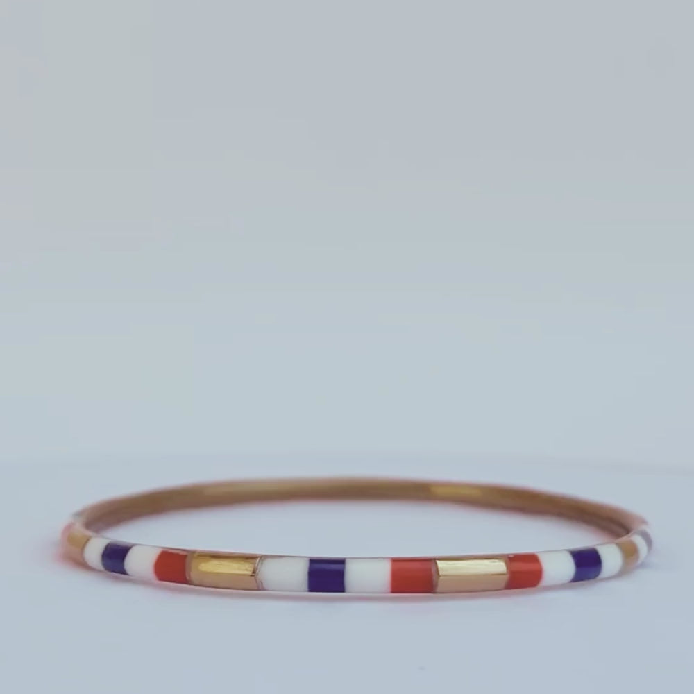 The red/orange, blue and white laquer design is handmade with anti-tarnish brass and will add a playful pop of colour to your outfit choice of the day. Stack them for more flair or wear it alone for a more relaxed look. Add a little finesse to any outfit with this beauty.